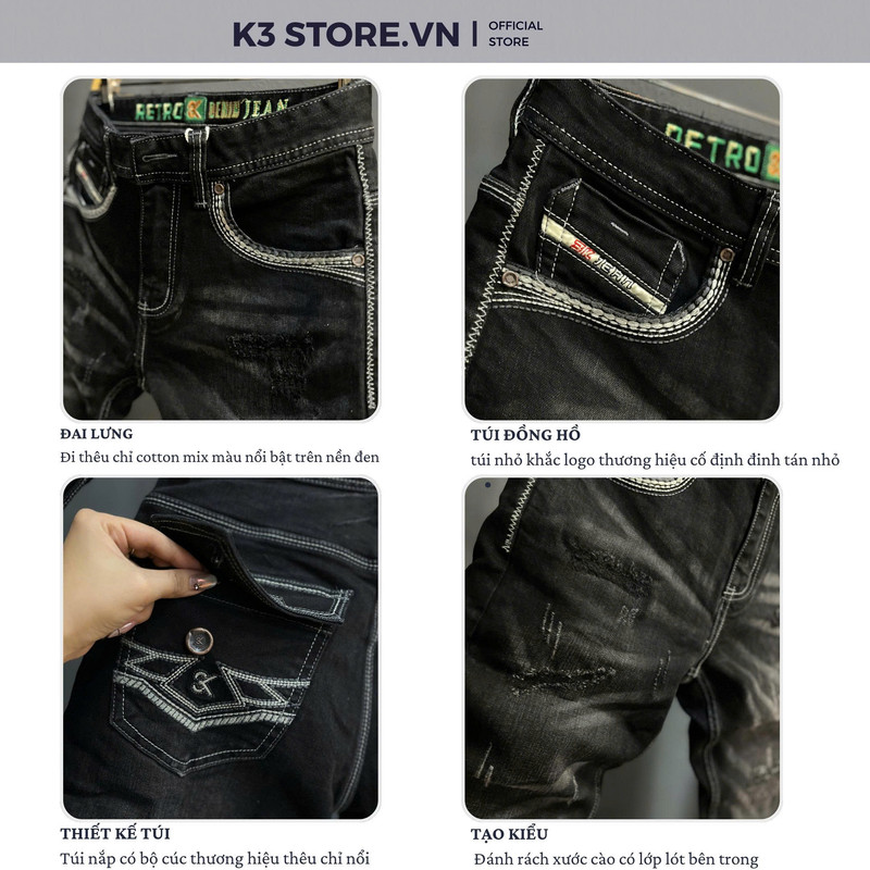 Jean Dài QCCC 3K-M14 Đen was chỉ độ túi dập da