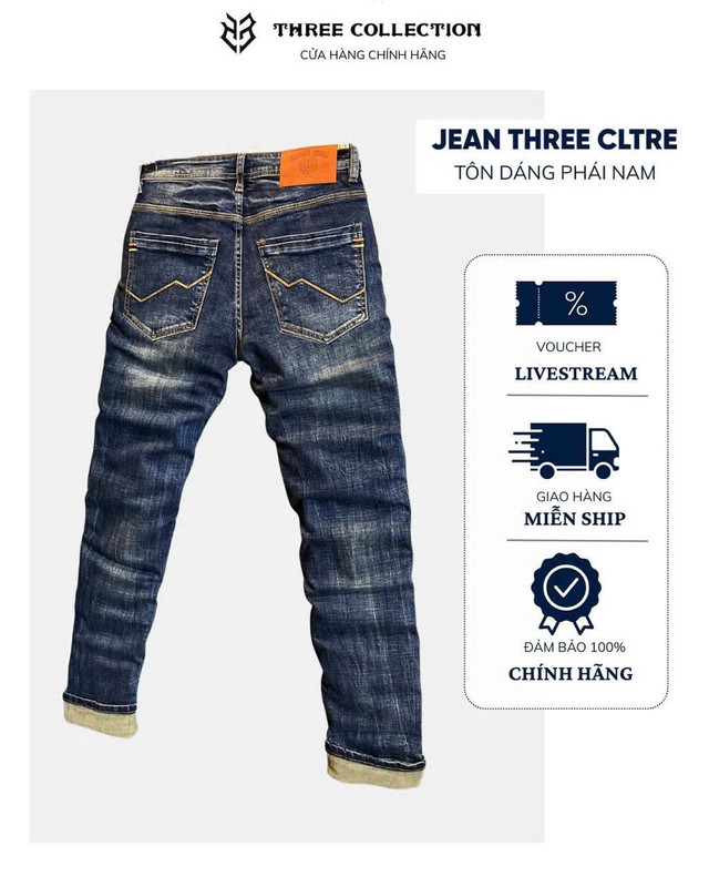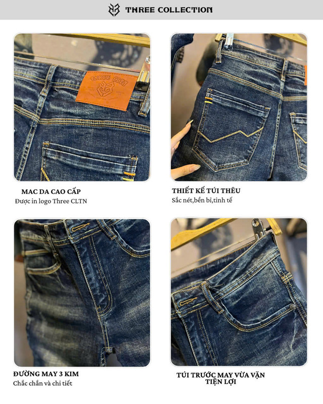 Jean Dài THREE VIP- JD1323 xanh was mạng thêu túi