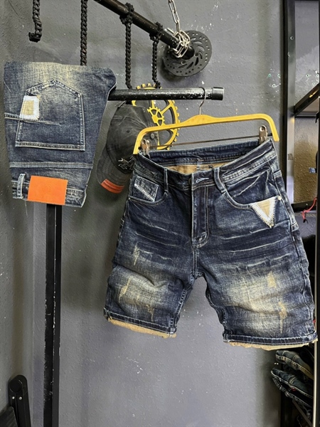 Mang đến cho bạn phong cách thời trang đầy khỏe khoắn và năng động với [Quần Short Jeans THREE CLTN-645] Quần Short Jean Nam Màu Xanh Đậm Was Ánh Đồng Đắp Vá Mạng Túi Mẫu Mới QS2009.
